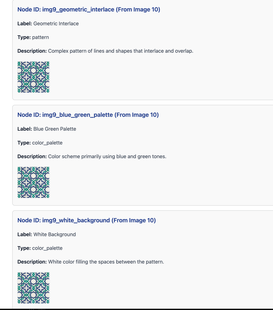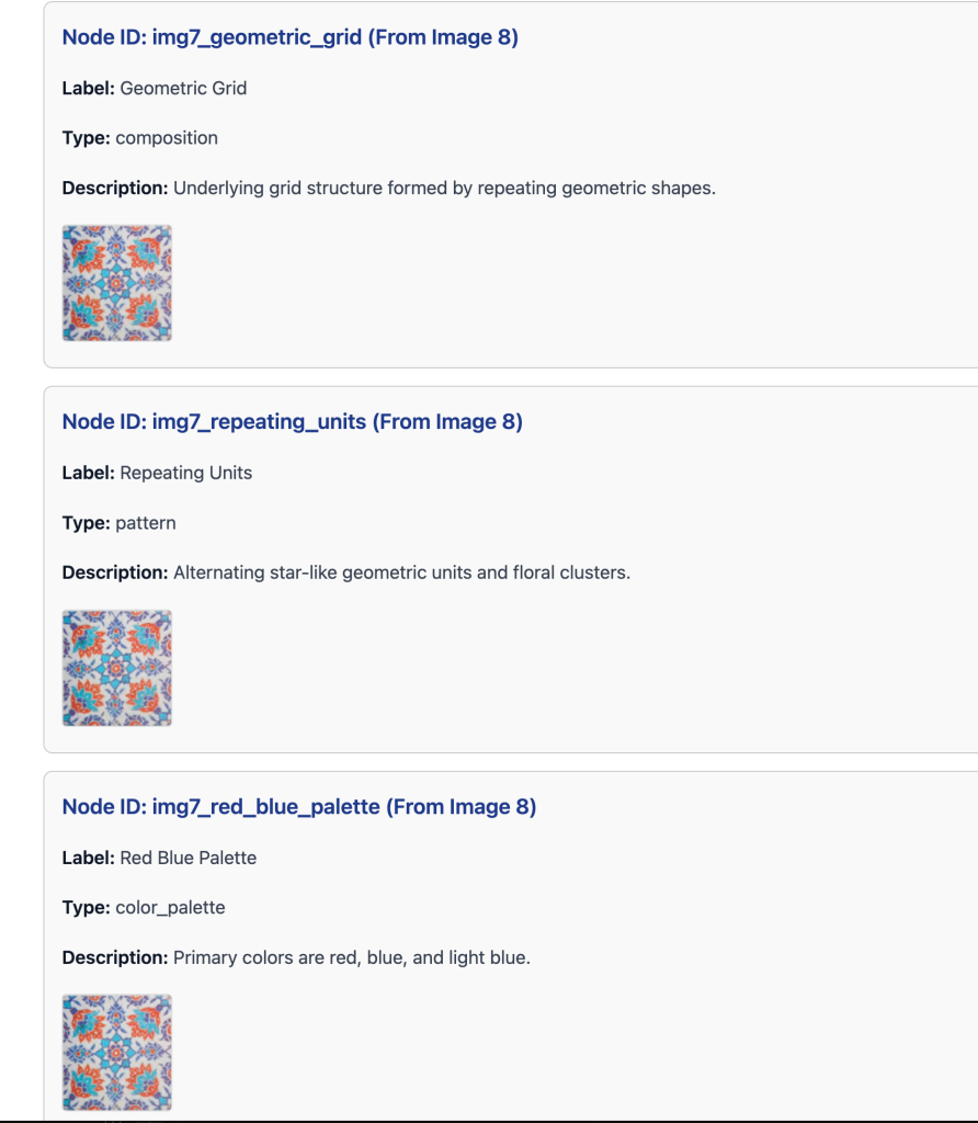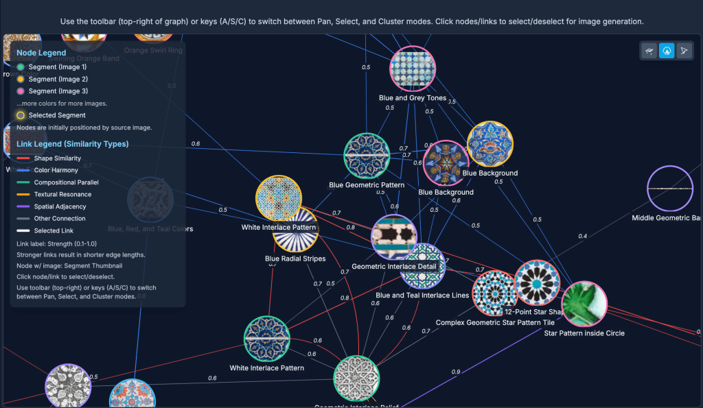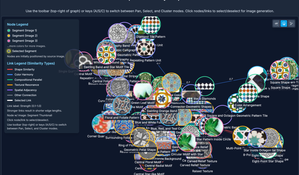 It then analyzes similarities between these “segment-features” (potential motifs) in terms of shape, composition, texture, and color, along with any contextual or historical connections included in the user’s annotations. Based on this analysis, it generates a graph where each node represents a segment-feature, and each link (or edge) indicates a similarity or connection between them. The strength of each connection is shown as a value between 0.0 and 1.0 next to each link.