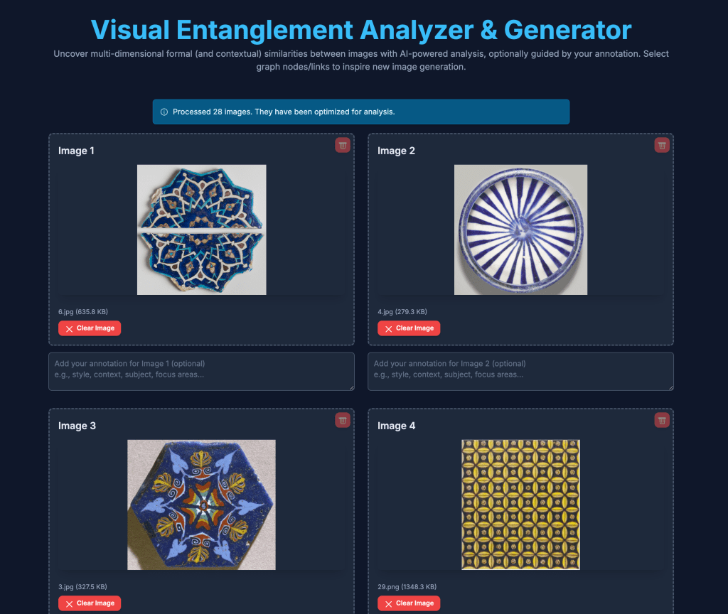 Built with Google AI APIs, this analyzer/generator accepts multiple images as input. Users can also optionally add annotations to each image to include information about form, significance, history, or any other context relevant to the analysis.